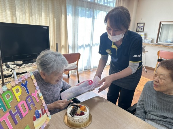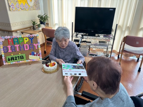 ご家族様からお誕生日プレゼントとステキなケーキをいただき、職員手作りのお祝いの色紙をプレゼントを手渡されました。