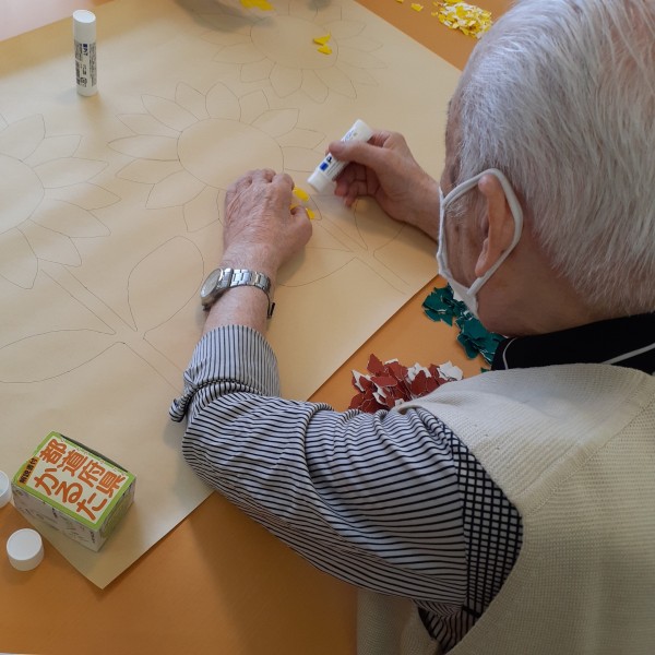 折り紙をちぎり、のり付けをして