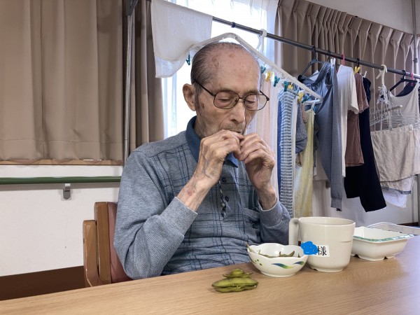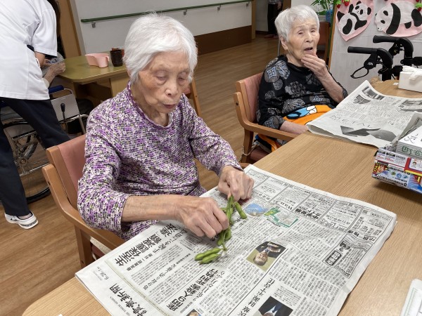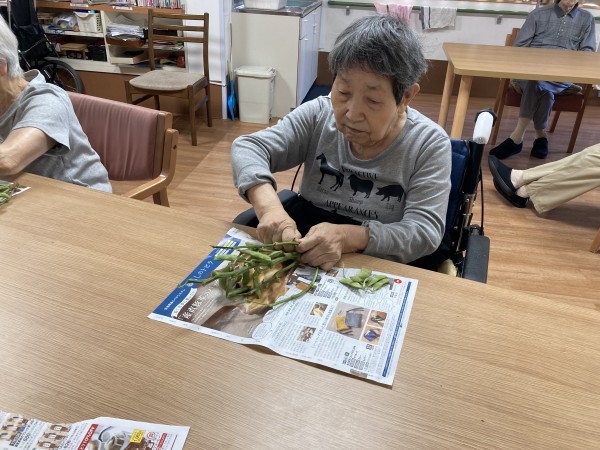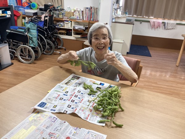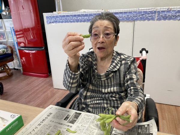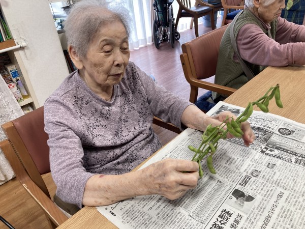 枝豆は枝付き。皆さんで手分けしてもらい枝から外してもらいました。