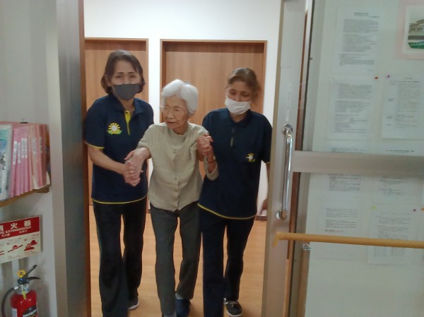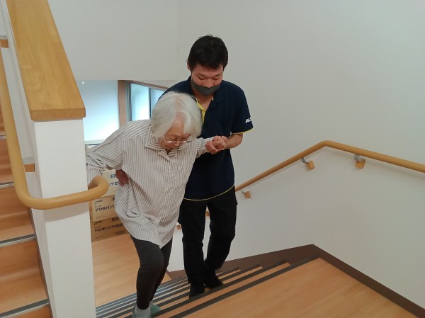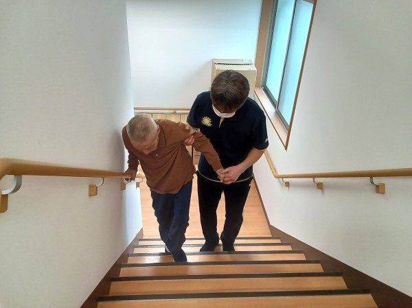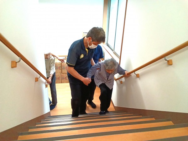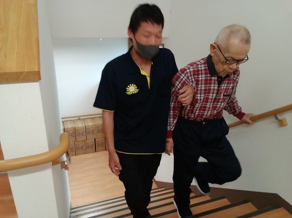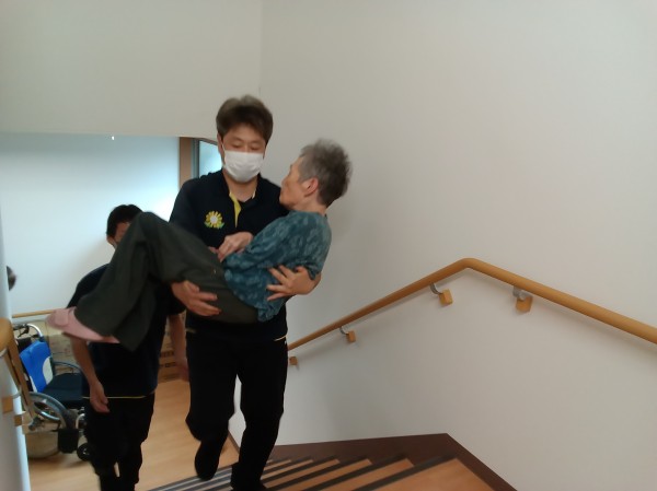 階段を手引き、身体を支えたり、抱えたりして2階へ階段を使用して上がりました。 今回は男性職員が2名いた為できました。