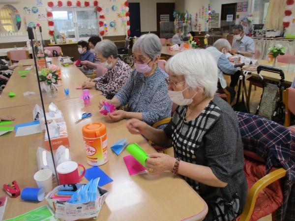 本日も、短冊にお願い事を書いた後、折り紙で飾りを作っていただきました。