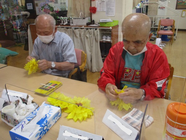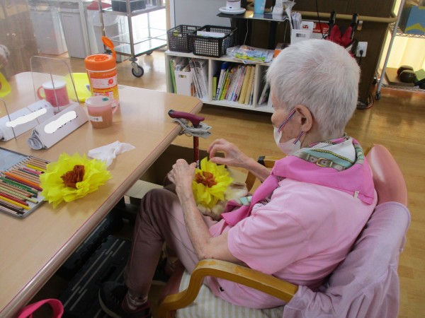 さらに今回は、お花紙を使って立体的なひまわりも手作りしました。花びらを一枚一枚広げていく作業は少し手間がかかりますが、「昔、こういうのを子供と作ったわね」と懐かしそうな表情を見せながら、皆様とても丁寧に取り組まれていらっしゃいました。