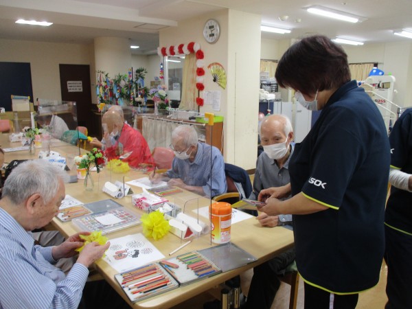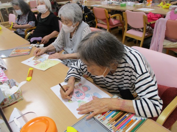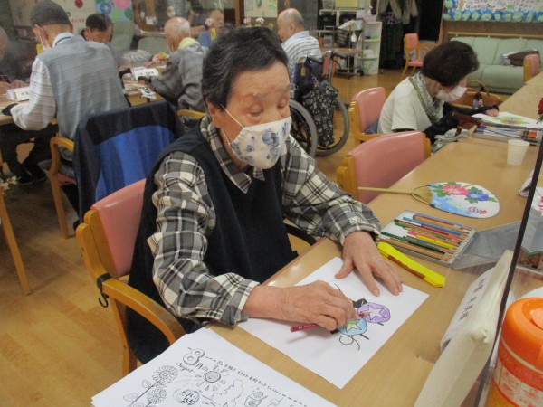 毎月恒例となっている、季節の塗り絵と飾り作り。8月は夏らしい「ひまわり」をテーマに取り組みました。