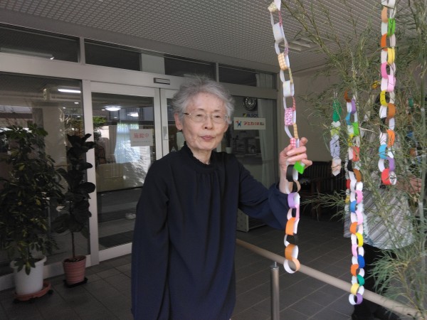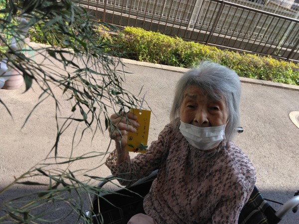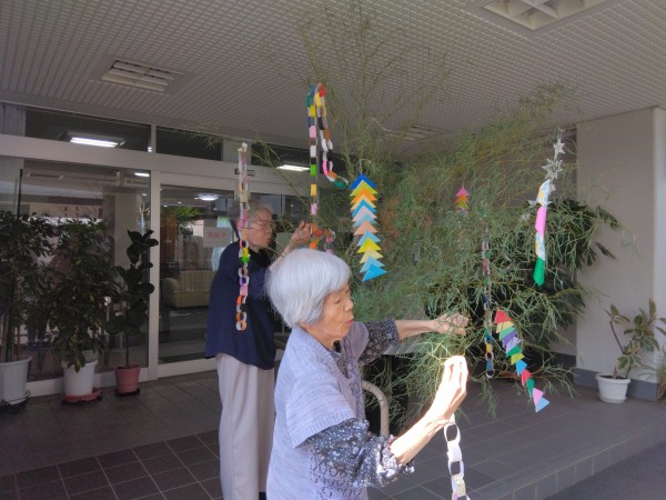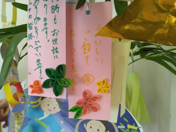 先日書いた短冊と七夕飾りを大きい笹に飾り付けしました♪