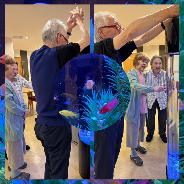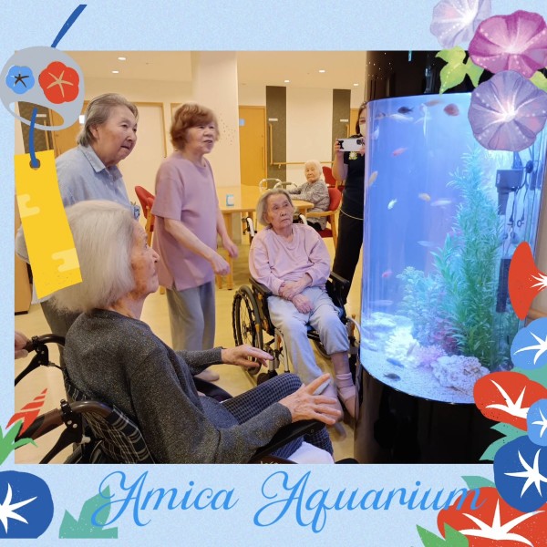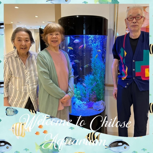 さて、アミカの郷ちとせでは、ご入居者さまに少しでも涼しさを感じていただきたく、このたび館内に「アクアリウム(水族館)」を設置しました!