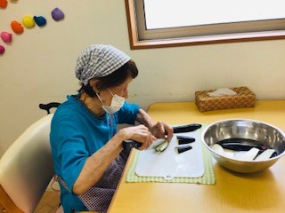 さっそく、ナスを天ぷら用にカットしていきましょう。