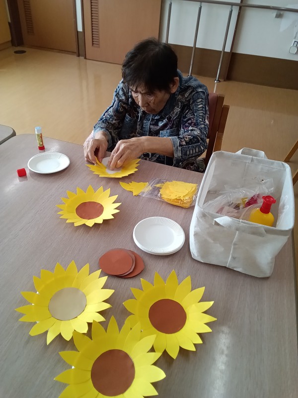 本日は夏にむけてご入居者様にひまわり作りのお手伝いをしていただきました。花びら1枚1枚丁寧に貼り付けて頂きました。