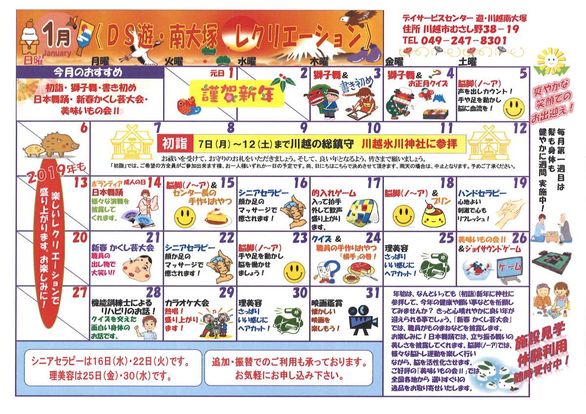 デイサービスセンター遊・川越南大塚 平成31年1月のレクリエーションカレンダーです。1月も当社オリジナルのNOAエクササイズを始め、シニアセラピー、かくし芸大会など楽しいプログラムが満載です‼是非見学にお越し下さい。