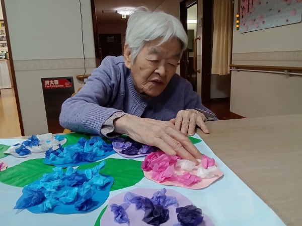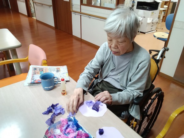 虹を作成の為、折り紙でちぎり絵です。細かい作業でしたが、少しずつ時間をかけて皆さんに貼っていただきました。