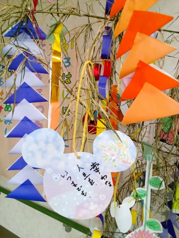 ミッキーの短冊に一人一人願い事を書いて、どこに飾ろうかなぁ~('ω')