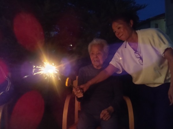 七夕の笹を前に玄関先で、花火大会をしました☆