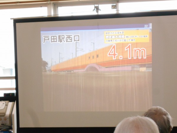 上の画面のように、氾濫した場合の戸田市役所や駅の写真も写されました。写真で見るだけでも驚きなのに、これが実際に起こったら身長の2倍以上の推移に・・・。