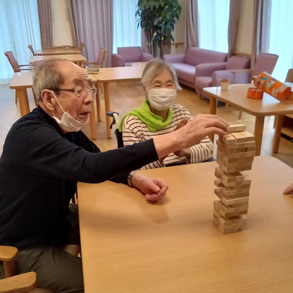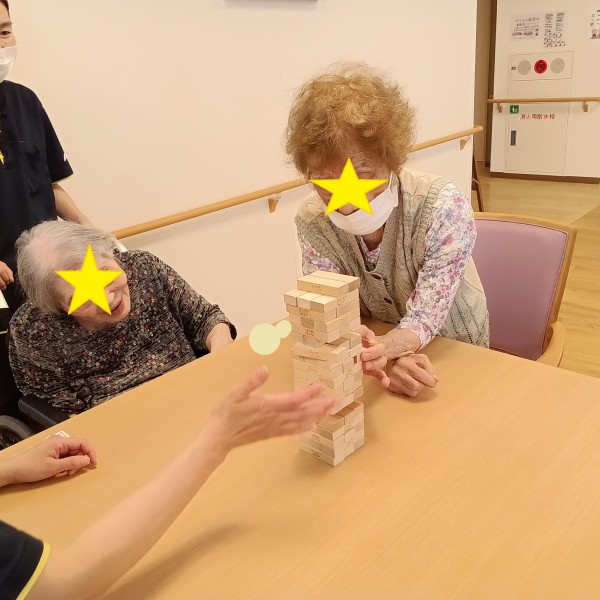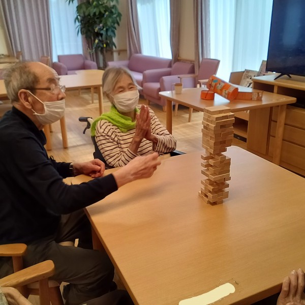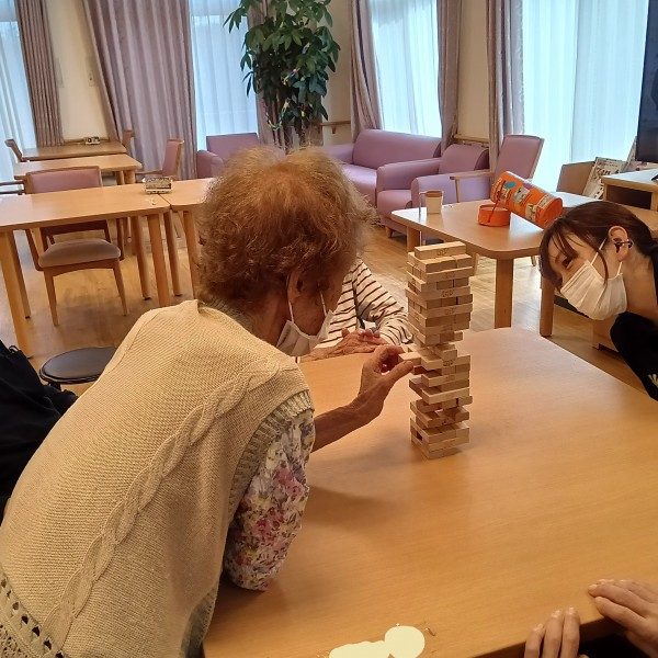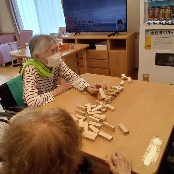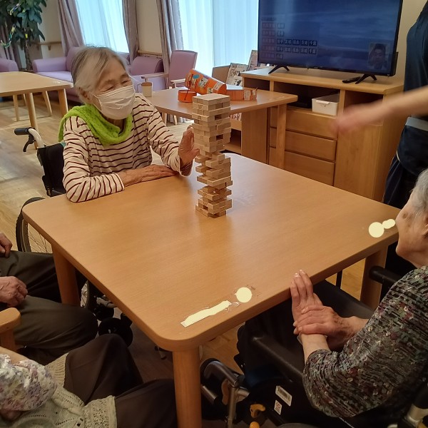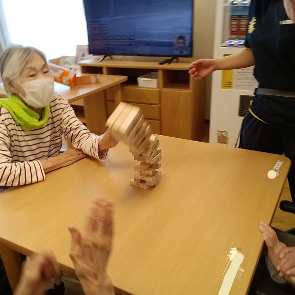 いつもテレビを見ているW様とI様、他階からジュースを求めて降りてこられたS様、居室からひょっこりお顔を出されたY様が大盛り上がり!!ジェンガを楽しんでいらっしゃいました。