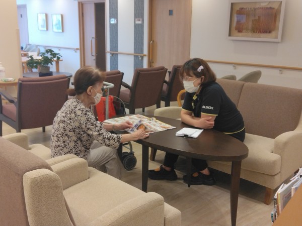 カタログショッピングをお客様とスタッフで選んでいる風景を一枚????