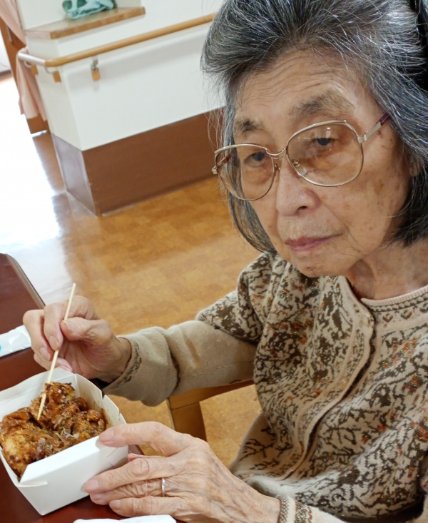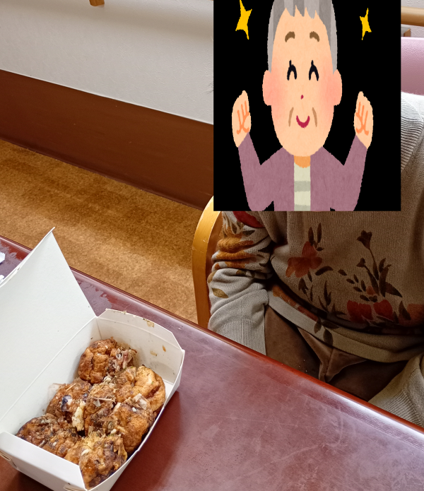 先日、施設近隣にある『とんぼ』というお店から材料を持ってきていただき、「たこ焼き・たい焼きレク」を行ないました。