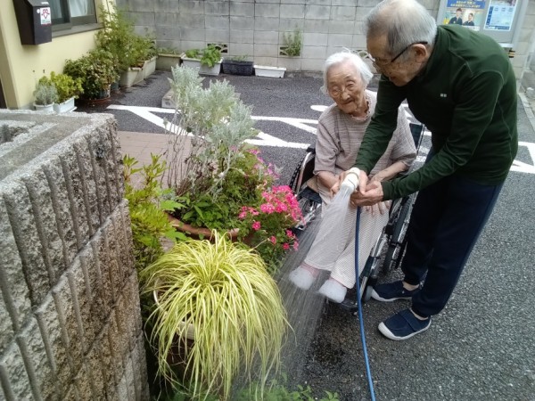 お花へ水やりで「和気あいあい」