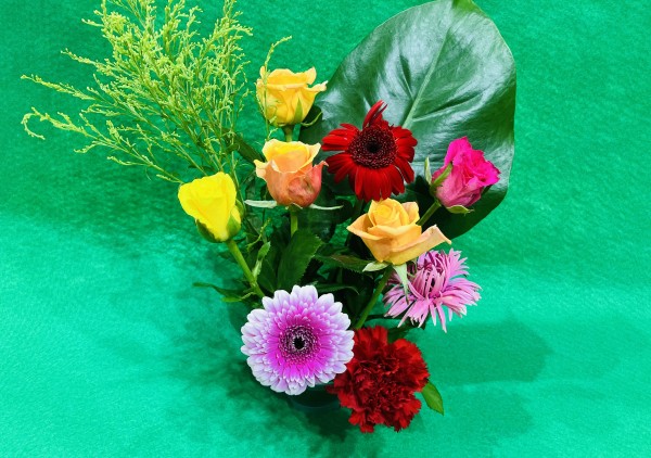 夏なのでお花を少しでも長持ちさせるには短く切ること!!とのことで全体的にショートにしてのアレンジメントでした!!
