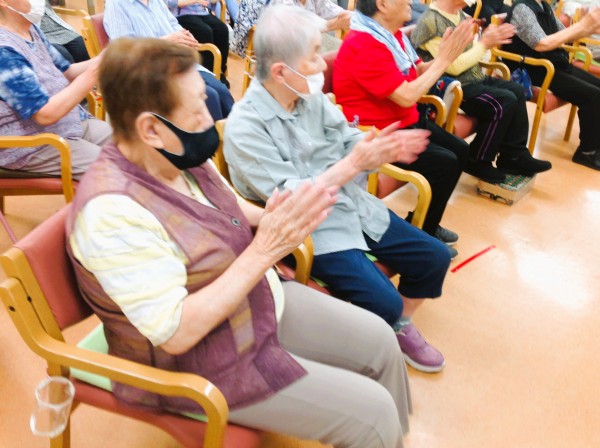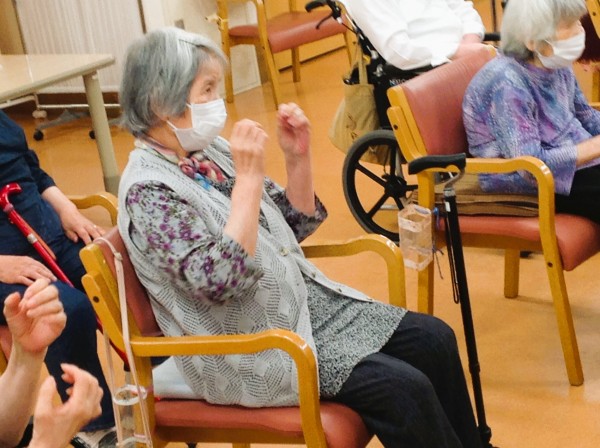 両手を広げ、手拍子しながら体の部位を叩いたり、体をぐいーーっと伸ばしたり、脚も上げ下げします!元気バリバリ!