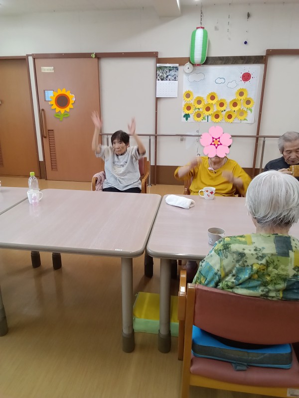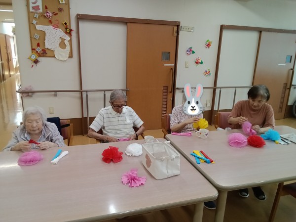 こんにちは。。。今回は、8月に向けての飾りつけのお花作りのお手伝いをして頂きました。皆様、真剣に取り組んでくれて沢山、広げなければと思っていましたが。。。あっという間に段ボール1箱いっぱいになりました。また、DVDの体操がかかっていないのに入居者様が体操を始めましたので、ビックリΣ(゚Д゚)