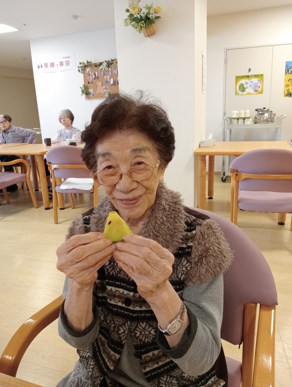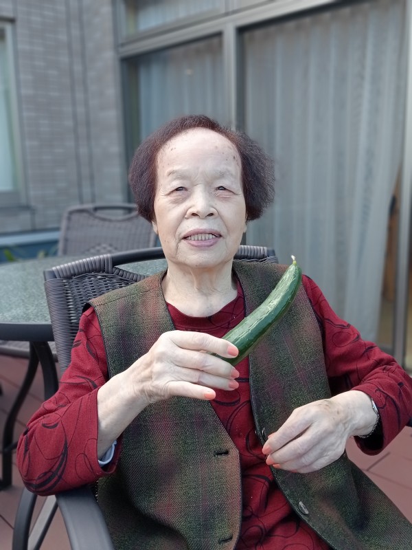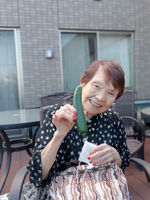 夏の太陽の光をたくさん浴びてよく実ったキュウリです。施設の皆様の水やりのおかげです。いつもありがとうございます。