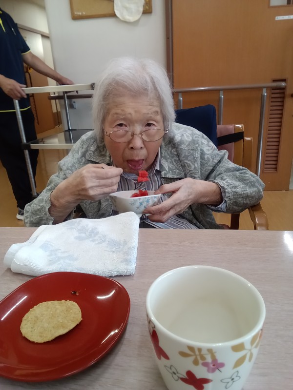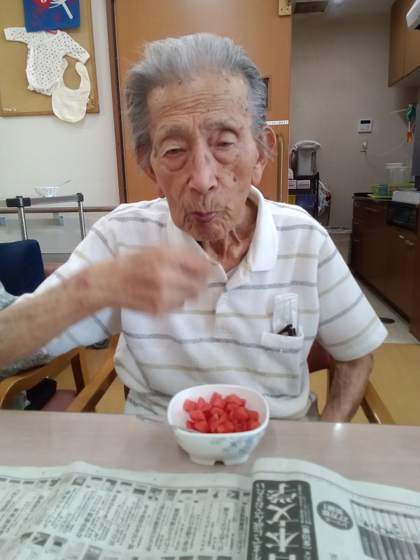 こんにちは。。。今回!またご家族様よりスイカを頂きました。ありがたいです。この異常気象のなか乗り越えていくには水分補給が大事で毎日同じような飲み物だた飽きてしまいますけど、たまに違うものが出てくるとすんなりと召し上がって頂けるので、スタッフとしては大変助かっています。