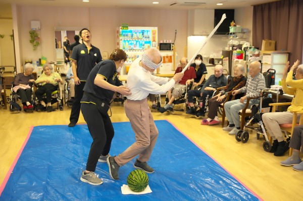 今回は毎年恒例のスイカ割りの様子をご覧いただきたいと思いますー!!
