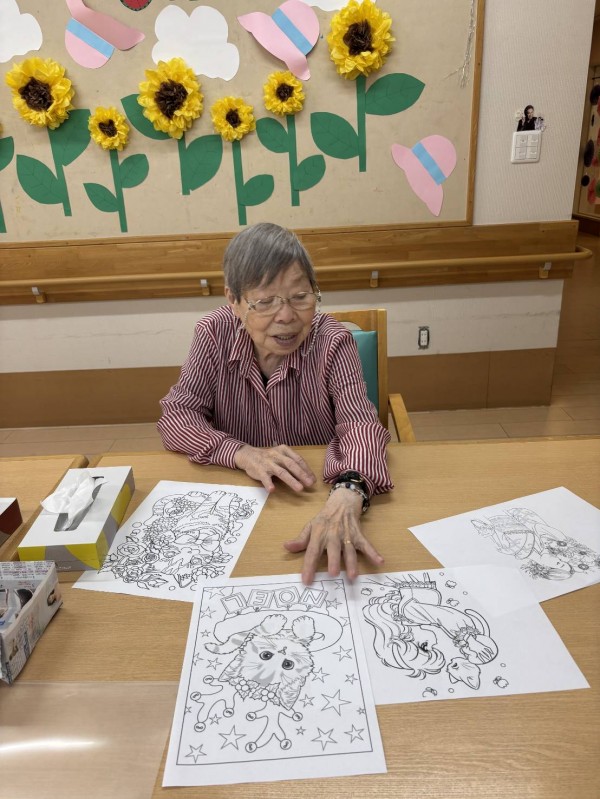 とても優しい色合いで塗って下さりましたᐠ( ᐢωᐢ )ᐟ塗り絵をお渡しした際には「可愛い!どれも良いわね!」と喜んで下さりましたヽ(✿❛◡❛)ノ