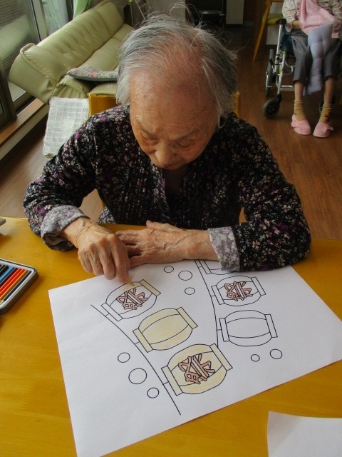 今日は塗り絵を行いました。 そのご様子をお知らせいたします!! ず~っと塗っておられます。 疲れませんか?