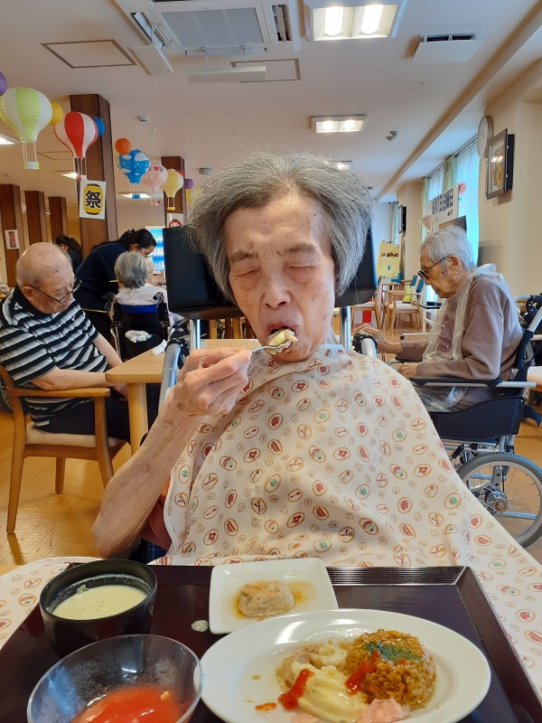 今回は納涼際ということで、納涼際ランチを皆さんに味わっていただきました。屋台でおなじみの焼きそば、焼き鳥、ポテト、たこ焼き、スイカです。久しぶりに味わう屋台メニュー。思わず笑顔になる至福の時ですね。お腹も心も満たされたかな。