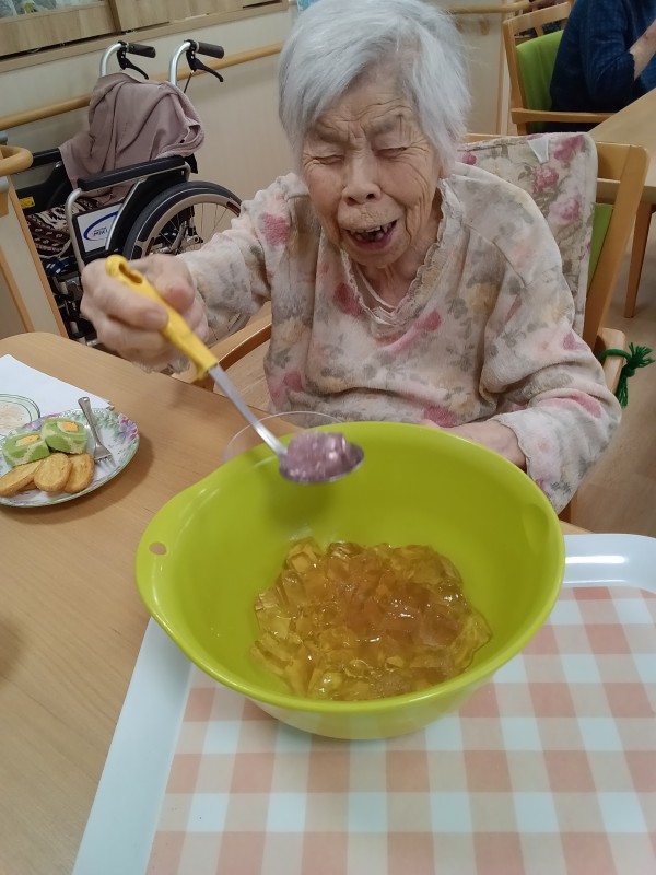 暑い日が続く中、おやつに冷た~いゼリーを召し上がって頂きました!