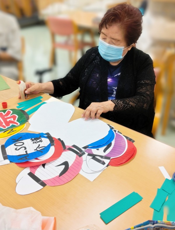 夏祭りに向けて印刷した飾りをハサミで切り抜いてももらい