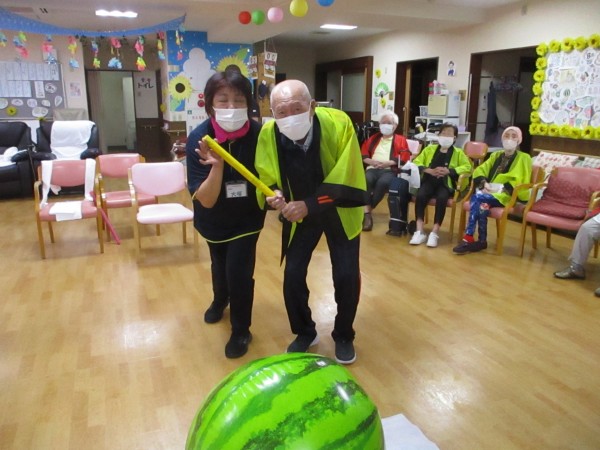 スイカ割りでは、目隠しをしてチャレンジ!応援の声が飛び交い、見事に命中すると大きな拍手が起こりました。