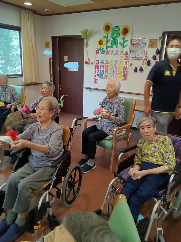 浴衣を用意することは出来ませんでしたが、手作りの団扇などをお渡しして盆踊りの雰囲気を味わっていただきました