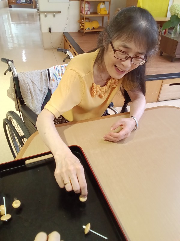 手作りの”駒”を回して「遊びましょう」と職員の提案に