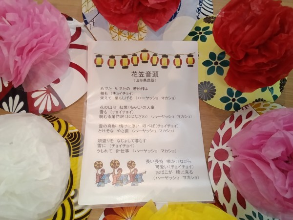 事前に用意した花笠(手作り)と団扇(東京音頭用)を使って、5日くらい前から「花笠音頭」の歌を歌詞カード無しで歌いました。