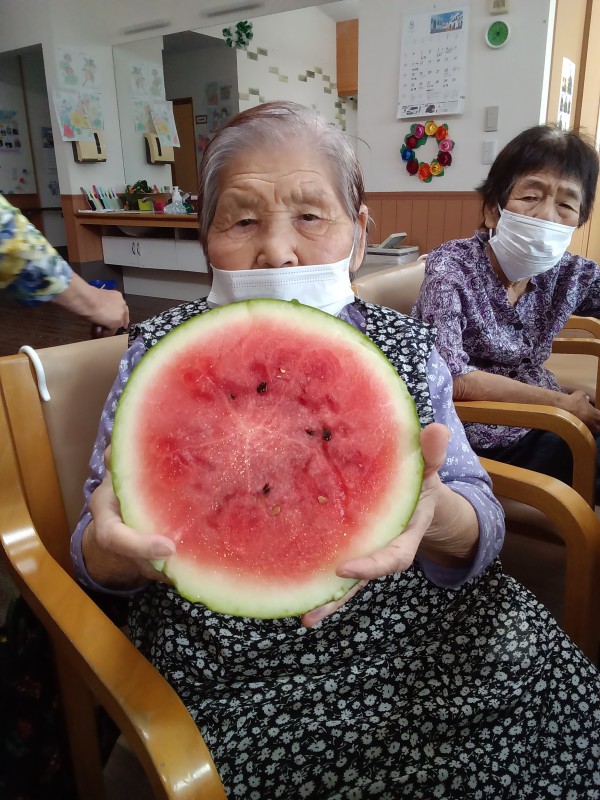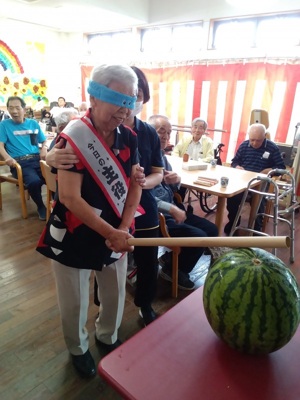 スイカ割りを楽しみました。利用者さんもみな驚いていました。スイカ割りは大人になると本当にやらないですよね。