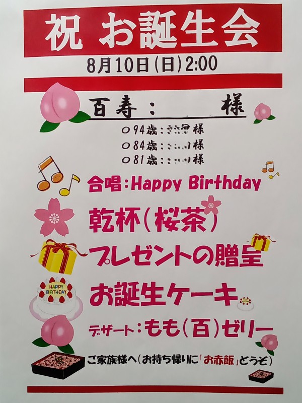 グループホームみんなの家・中野鷺宮で8月のお誕生会で「百寿」のお祝い