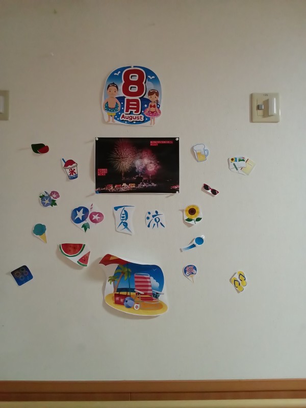 1階の壁画では、夏に関連するもの(花火、あさがお、ひまわり、など)を