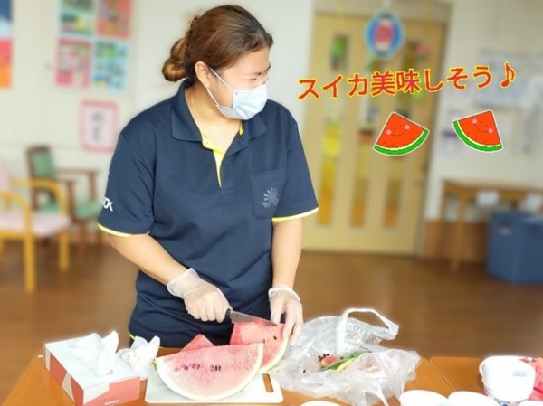 スイカを切ってくれているスタッフも☆