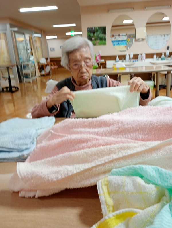 今回のブログでは山積みタオルを畳むのを手伝ってくださるご利用者様の様子をお見せします♪♪