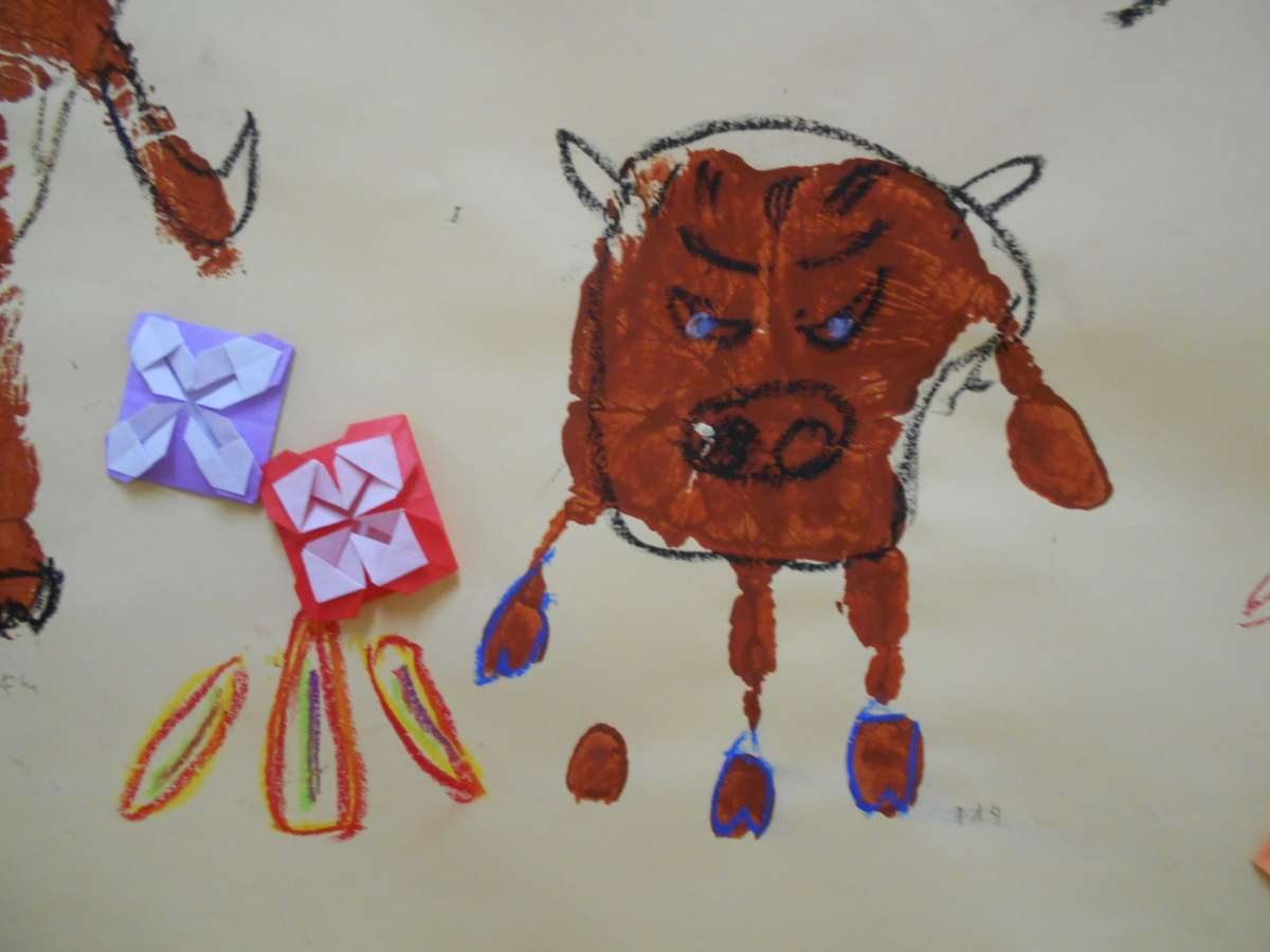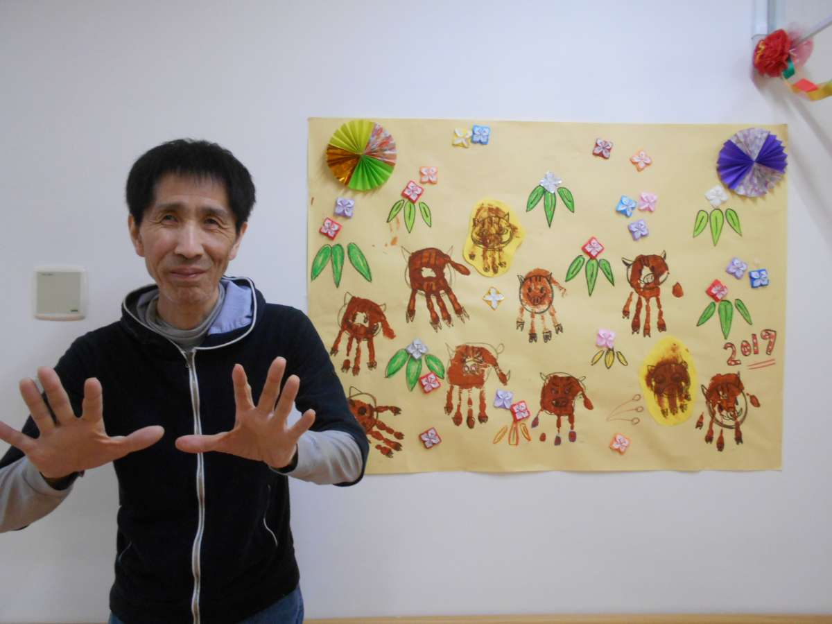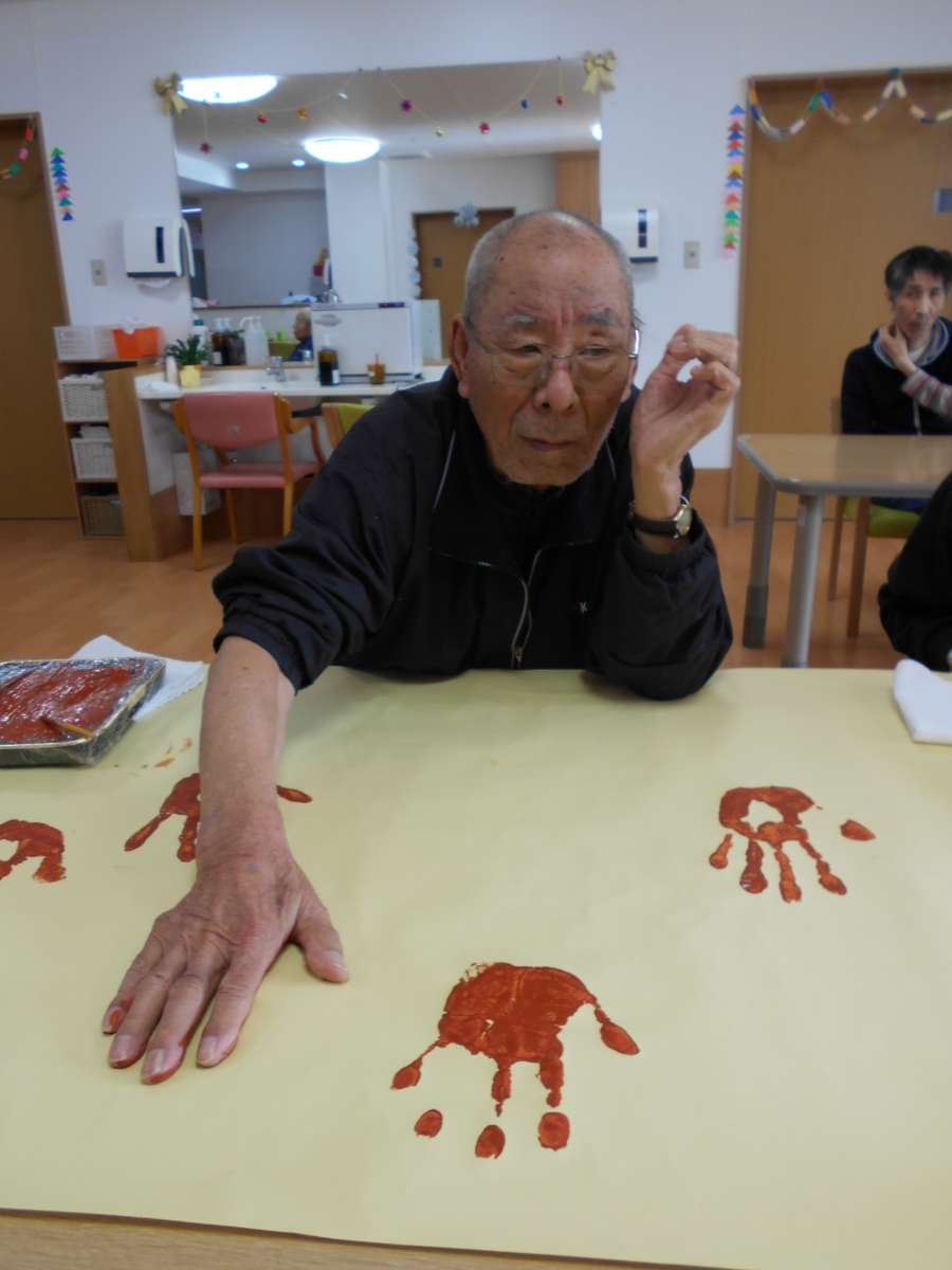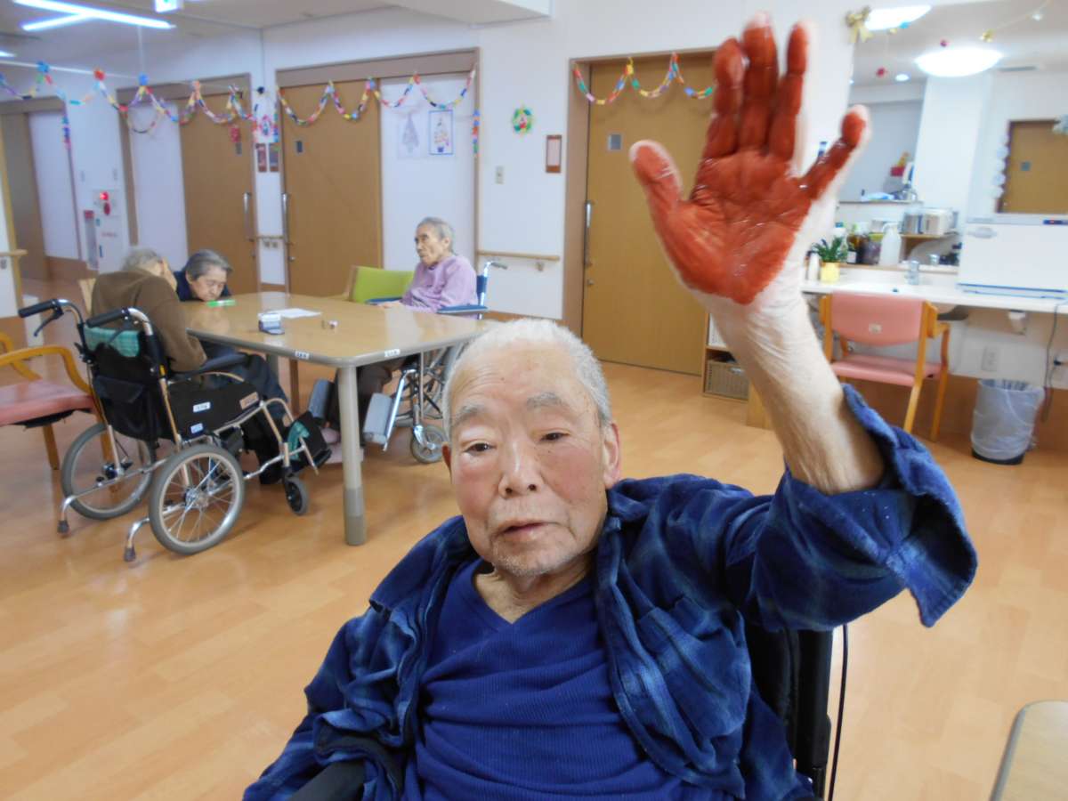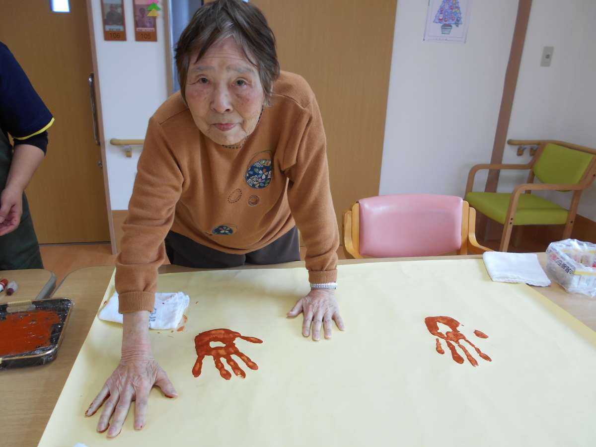 内野本郷1階では12月の中旬から、ご利用様の手のひらを絵具で塗り塗りして