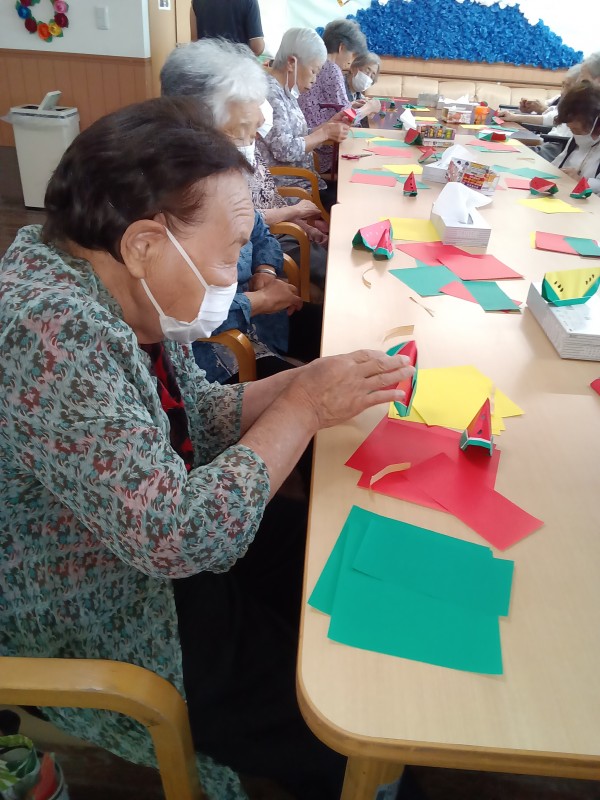 前回は鶴で、今回は夏らしい向日葵と西瓜の折り紙を教えて下さいました!