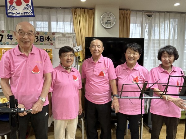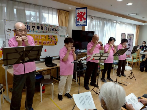 お馴染み【山茶花】の皆様にお越し頂き、ハーモニカ演奏会も開催されてました。ピンクのポロシャツも皆様お似合いです!今回も早口言葉から始まり、演奏は勿論のこと楽しいトークも充実していました!