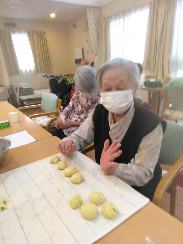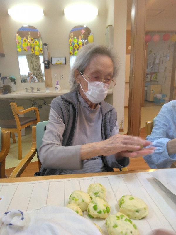 枝豆を混ぜ込んだパンは、コロコロ丸めるのも楽しくて「かわいい形になったね」と笑顔があふれました。