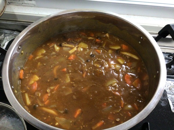 切って頂いた野菜を炒めて~、カレールーを入れて~。