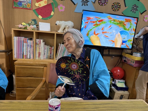 うちわをもって・・・祭りですねえ