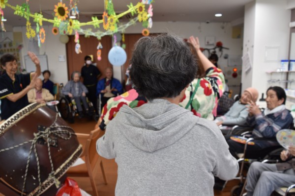 皆様の取り囲むようにして座って頂き、盆踊りに合わせて踊りに参加して頂きました♪