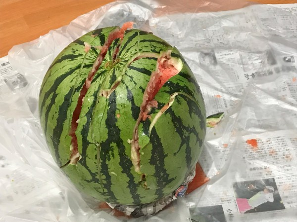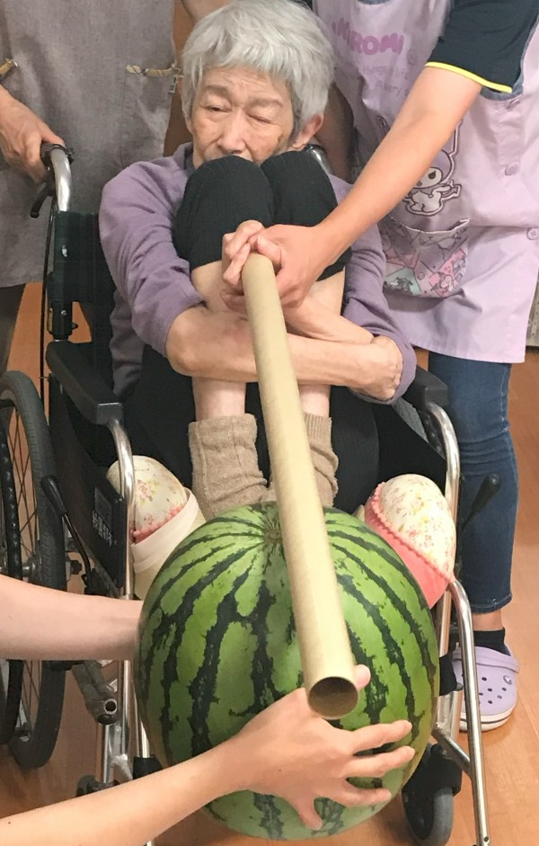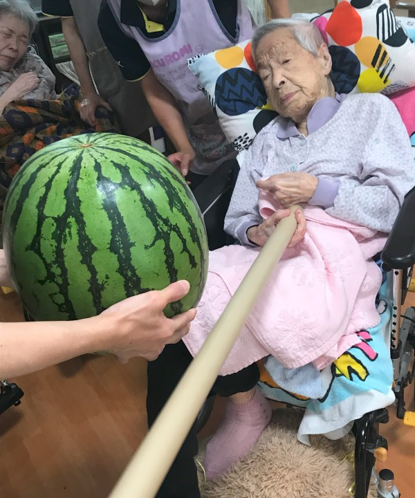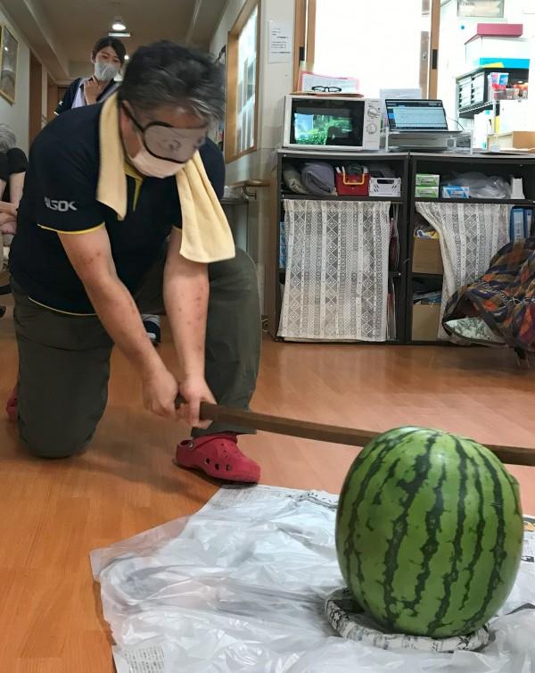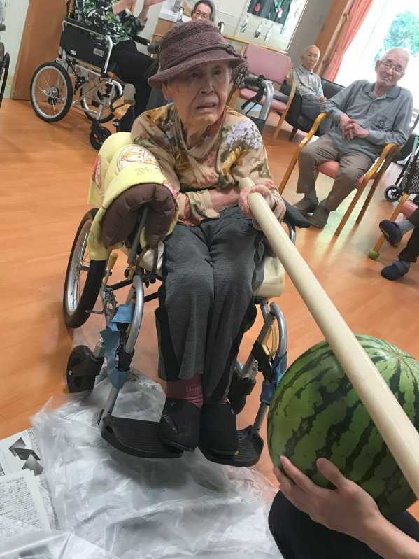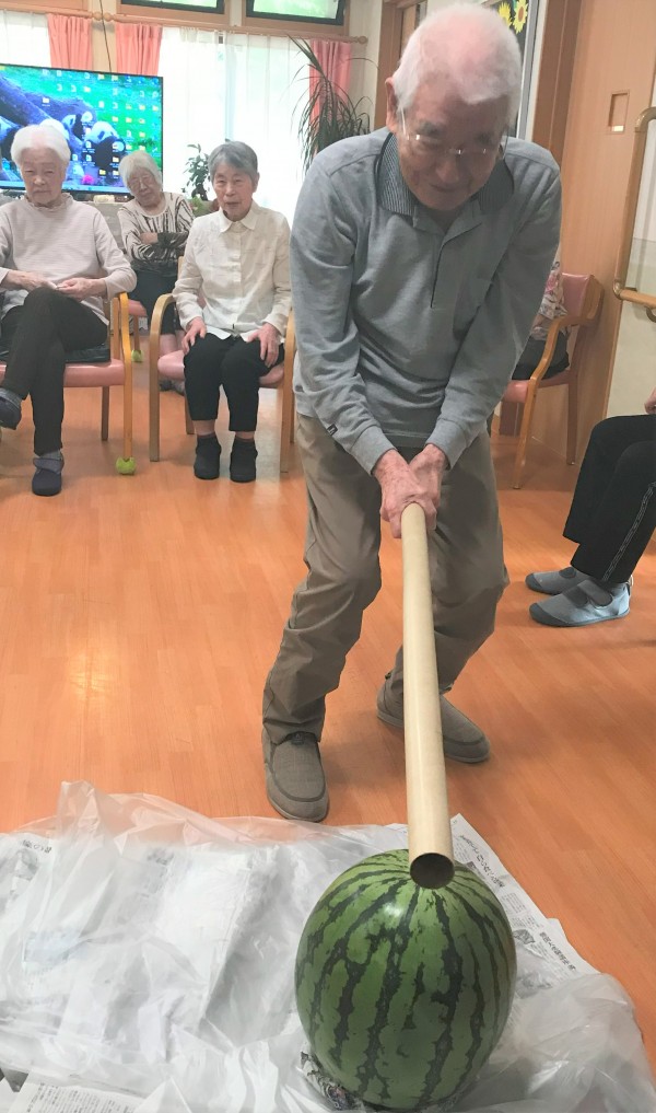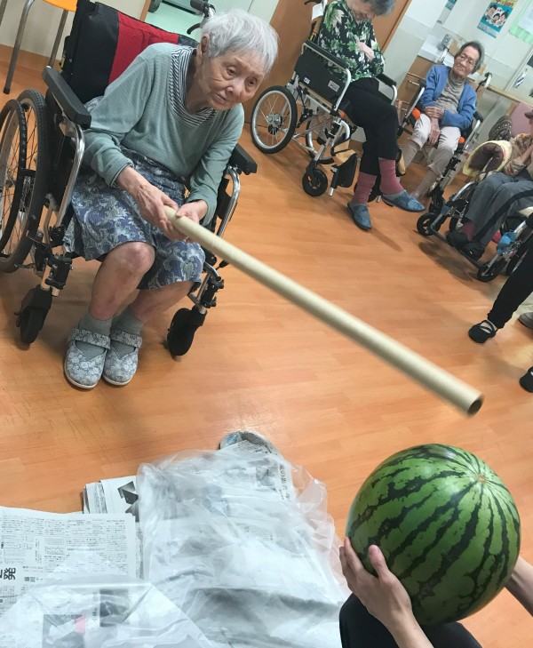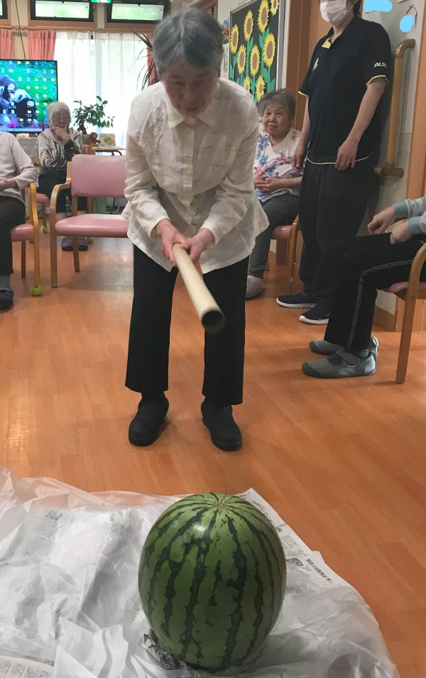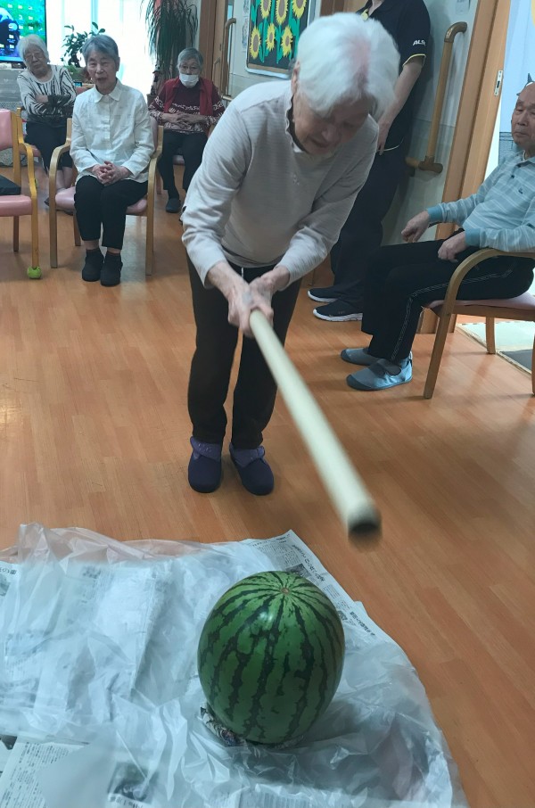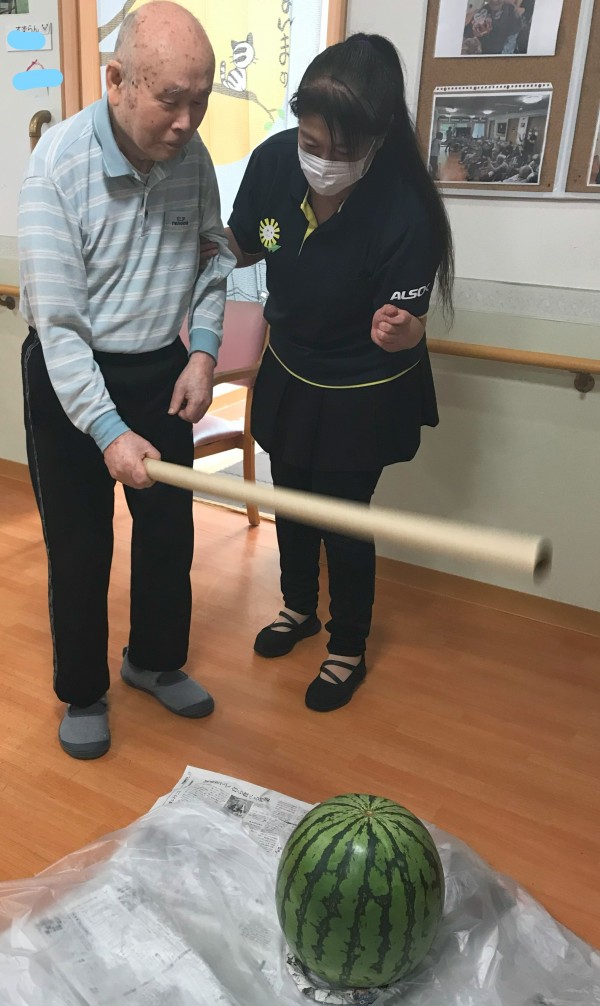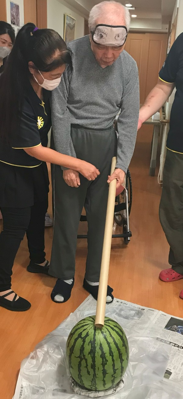 少し遅くなりましたがホームではすいか割り大会を開催しました!