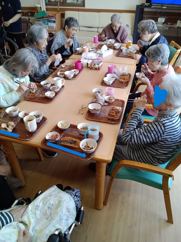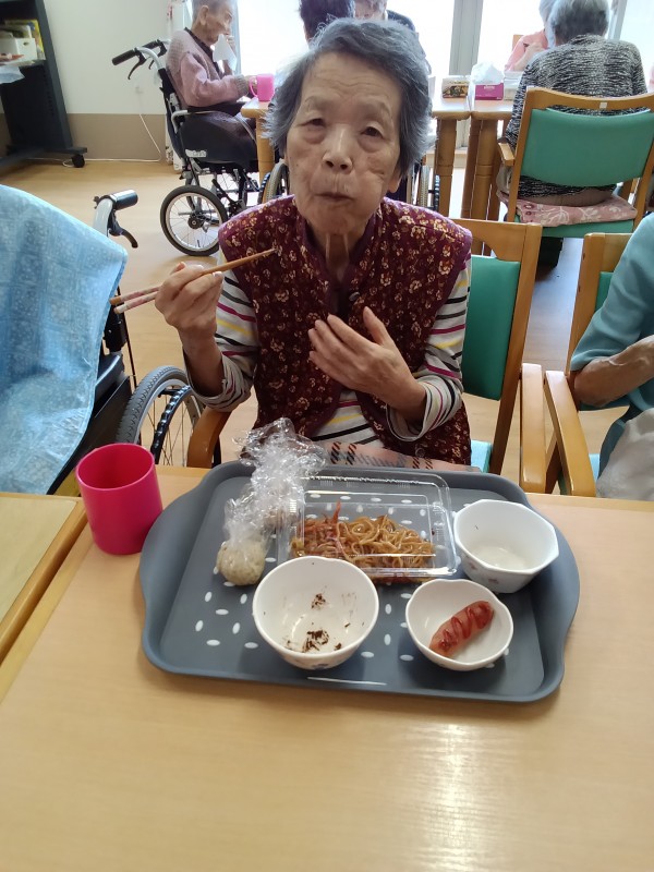 職員手作りの 焼きそば フランクフルト カツオや鮭風味のおにぎり に