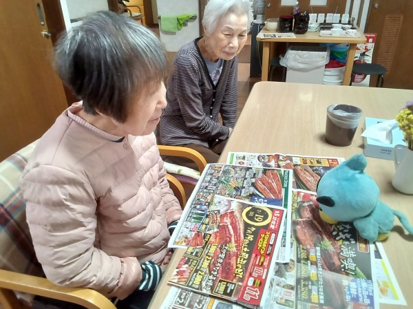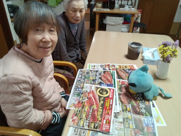 ぼくがホームにいなかったのがさびしかったそうです。久しぶりにお会いして一緒に新聞の折り込み広告を見て楽しんでいました。
